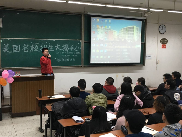 2017年3月18日晚上7点整,由化学学院、yl23411永利(集团)有限公司官网、建筑与环境学院、法学院、商学院五个学院的团委学生会创业就业促进部联合举办的美国名校招生大揭秘讲座在四川大学江安校区第一教学楼B座307举行。AlfieWu吴老师及2014级化学学院团委学生会创就部部长罗景文同学在会上进行了讲话。全校有意留学美国的一百一十个学生参加了此次讲座。本次讲座旨在让更多怀揣着世界名校梦的学子成功圆梦,让国内学生和名校招生官面对面深入交流,深入了解他们的成长经历、他们的留学生活以及他们的名校招生细节,为川大学子提供一个专业的留学咨询与交流平台,加深大家对出国留学、名校招生各流程的了解,以便做好自己的人生和职业规划,更好地经营自己的人生。