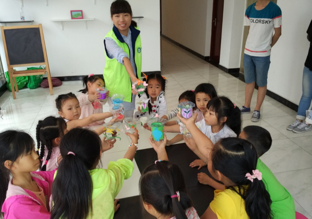 下午三点半,4名志愿者准时到达场地,准备检查活动物资,先和青少年聊天嬉闹,为正式的活动进行预热。下午四点,活动准时开始,首先由一名志愿者为青少年普及白色垃圾的知识,倡导保护环境的重要性,然后引向今天的主题塑料花瓶。向青少年们讲述活动的要求,正式开展活动。志愿者们立刻分工,一名志愿者主讲,其余对青少年进行一对三的专门指导。