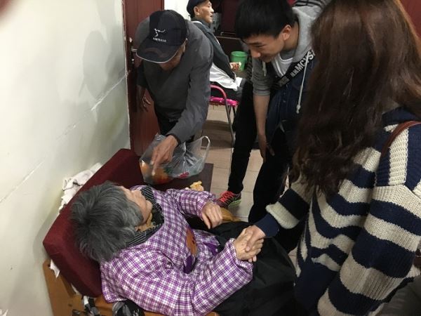服务站的站长接待了志愿者们,并向老人们介绍了志愿者们。志愿者们开始和老人们交谈起来,为他们削苹果,讲故事。有的志愿者为老人们唱红歌,成功地活跃了气氛。有的志愿者还和老人们一起拍照,老人们的脸上露出了幸福的笑容。老人们谈得很尽兴,和志愿者们讲起来自己年轻时候的故事。有的老人还为志愿者唱歌。在护工的带领下,志愿者为老人们整理床铺,打扫卫生。11时30分,老人们吃午饭的时间到了。站长和护工们将饭菜分好,志愿者们帮着把饭菜端到老人们面前,开始喂老人们吃饭。最后,志愿者们以一个手语操表演,道别了服务中心的老人们。
