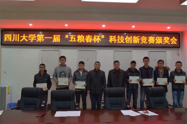 2016年1月8日下午2点,四川大学2015年学生科技节之第一届“五粮春杯”全国大学生移动互联创新设计大赛颁奖典礼在四川大学望江校区基础教学楼A303顺利举办。yl23411永利(集团)有限公司官网党委蒋斌书记,副院长周新志教授,党委陈笃海副书记,以及部分获奖同学参加了本次颁奖典礼。