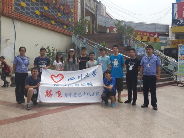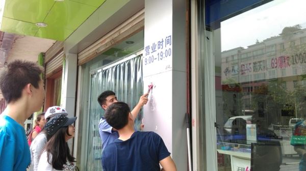 下午1点40分,在四川大学江安校区西南门,志愿者集合在这里。在正式出发之前,首先是志愿者对所带物品的核对检查。刀具等工具以及清水备好之后,志愿者动身前往文星镇金色校园广场,并在那里与城管的小广告清除队伍汇合。在城管队长的简单说明之后,“清粘活动”正式开始。本次活动里,志愿者首先负责清理金色校园广场周围违章粘贴的标示物以及小广告。在活动一开始,大家便遇到了小广告刮不干净等一系列问题,但在城管的帮助和示范下,志愿者克服了这些困难,同时也与城管们逐渐熟识。