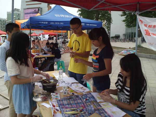 5月15日早上7点半,志愿者在6舍围合门口集合搬运物资,将物资搬至青广后开始布置摊位,志愿者们先用小锅煮水,并加入氢氧化钠浸泡叶子,做好准备,于8点整正式开始活动。 不一会儿,有兴趣制作书签的同学纷纷来到摊位,志愿者们热心招待他们,为他们准备好需要的工具,细心指导同学们如何刷去叶肉,涂上染料,告诉他们怎么做更好看,并帮助同学们将处理好的树叶与自己同血型的书签封装好。在制作书签过程中,志愿者们也为同学们普及献血知识,并指出同学们对无偿献血的一些错误观点,鼓励同学们在身体条件允许的情况下积极参与无偿献血。这次活动中也出现了煮水的燃料用完了的情况,且无法联系到实验室老师提供燃料,志愿者们便自带热水进行暂时处理。闲暇时,志愿者们也会自己制作书签,并在活动第二天送给有兴趣而没有时间亲手制作的同学们。5月15日18点整,志愿者们整理物资,清扫场地,活动正式结束。
