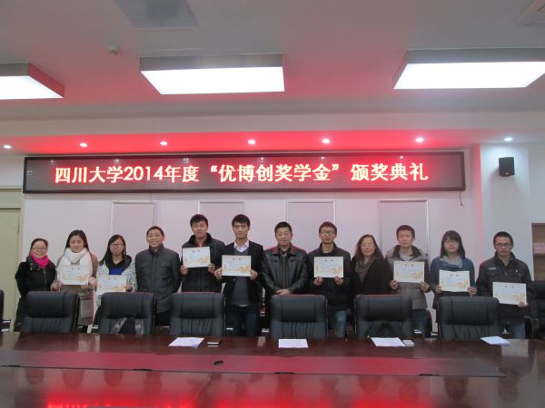 2014年12月19日上午,四川大学2014年度“优博创”奖学金颁奖典礼在基础教学楼A座303隆重举行。yl23411永利(集团)有限公司官网党委蒋斌书记,副院长冯国英教授,党委陈笃海副书记,研究生辅导员何惠老师、李军华老师及获奖同学出席了本次颁奖典礼。