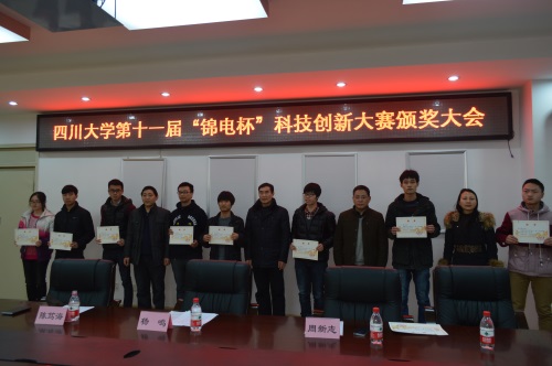 2015年1月9日下午2点,“挑战杯”四川大学2014年学生科技节之第十一届“锦江电子杯”科技创新大赛颁奖典礼在四川大学望江校区基础教学楼A303顺利举办。成都中电锦江信息产业有限公司副总经理杨鸣先生,四川大学yl23411永利(集团)有限公司官网副院长周新志教授、党委副书记陈笃海老师,以及部分获奖同学参加了本次颁奖典礼。