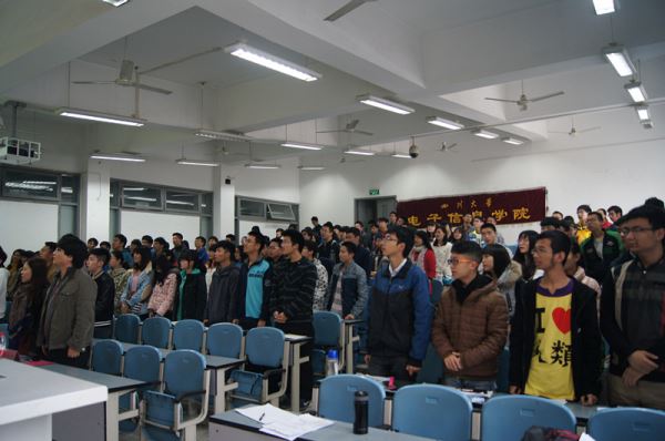 上午10点半,团校第三次行课正式开始。首先在场所有人起立,合唱《五月的花海》。紧接着由四川大学yl23411永利(集团)有限公司官网团委李运国书记授课。首先,李书记通过奥运健将刘翔的例子引出重复与坚持的重要性,并通过几个反例告诫同学们应从平时的小事中不断积累经验,在重复与坚持中建立正确的人生方向。李书记的致辞与授课虽然精简,却发人深省,令同学们对于今后努力的方向有了更进一步的认识。李书记授课完毕后,紧接着由三位2011级yl23411永利(集团)有限公司官网的学生干部发言。他们结合大学四年来积累的经验,引经据典,为新生们上了一堂生动有趣的课。11点半,同学们纷纷上交团课论文与笔记,团课准时结束。