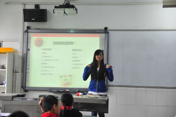 上午10点30分,志愿者们来到了天府新区西寺小学。在短暂的交接过后,志愿者们便开始了课前准备。11点30分,行课正式开始。在自我介绍之后,志愿者们首先分发了脊柱知识调查问卷。认真地填好了问卷,同学们在志愿者老师的引导下做了一场热身小游戏,随即便投入了健康知识的海洋。志愿者老师用动漫人物“大雄”为同学们讲解了脊柱问题的产生、症状以及如何处理等知识,同学们积极参与,踊跃发言,促进了课堂的顺利进行。最后,志愿者老师带领着同学们一起完成了“脊柱保健操”。欢声笑语之后,已经来到了下课时间。12点05分,志愿者们离开了教室,结束了第一次授课。