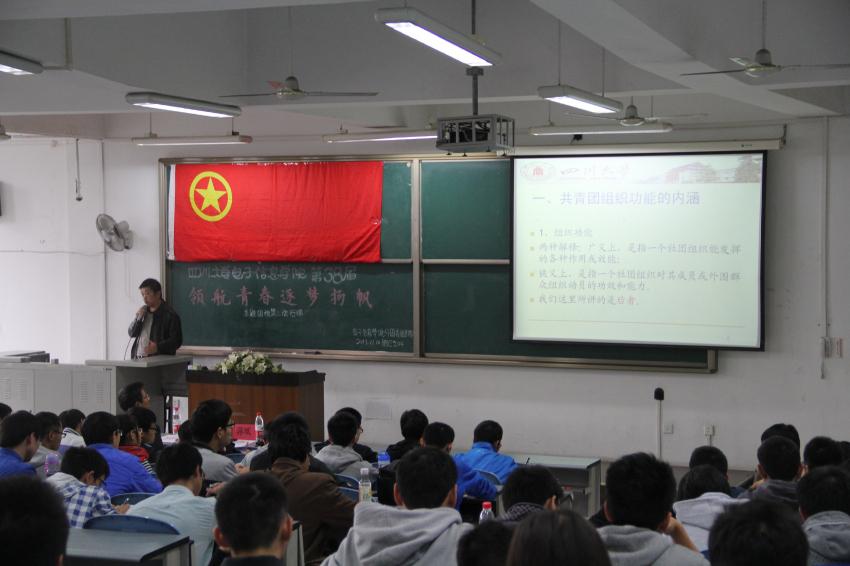 在全体充满激情地合唱庄严的团歌之后,主持人首先宣布团校第二次行课正式开始,蒋书记首先向同学们讲解了共青团组织的含义,并从共青团组织功能的内涵、共青团组织功能实现的载体及重要地位、共青团组织功能实现面临的挑战、共青团组织功能实现的基础、共青团组织功能实现的路径等方面进行了细致深入的讲解。