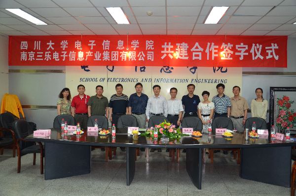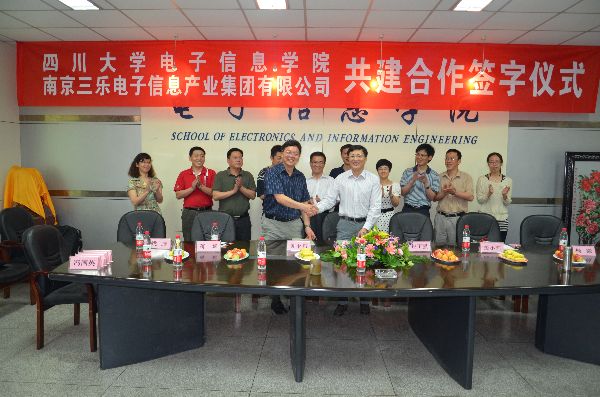 5月8日上午,四川大学yl23411永利(集团)有限公司官网与南京三乐电子信息产业集团有限公司举行了共建人才培养、实习实践基地合作协议签字仪式在四川大学望江校区基础教学楼A-110举行。南京三乐电子信息产业集团党委书记施秋生与四川大学yl23411永利(集团)有限公司官网院长黄卡玛代表双方在合作协议书上签字并交换了协议。南京三乐公司副总经理包正强及公司刘超、颜小莉、浩明、姚腾、杨微等,四川大学yl23411永利(集团)有限公司官网党委书记蒋斌、副院长何小海、副院长周新志、副书记陈笃海、工会主席熊淑华等参加了签字仪式。