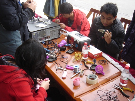 这次活动是yl23411永利(集团)有限公司官网研究生分会和物理学院研究生分会举办的。为了“服务同学,完善自我“的宗旨,志愿者们免费为同学们维修电脑、Mp3、耳机、台灯、优盘、电风吹、手电筒等。早早地我们的志愿者们桌上各种维修工具万用表、电烙铁、焊锡丝、螺丝刀等就一应俱全。因此上午开始桌前就聚集了不少需要帮助的同学,到了中午桌上不再仅仅是维修工具,也同样摆满同学们的各种坏掉电器。再看看我们的维修人员吧,忙着卸螺丝、上焊锡、查电路,真是恨不得一只手能当两只来用。他们不仅仅在忙着手里的活,还不停地向同学们讲述维修知识。一位同学看着自己的机器上拆下的电路板,看得出神,仿佛要忍不住借一把烙铁自己去焊。
