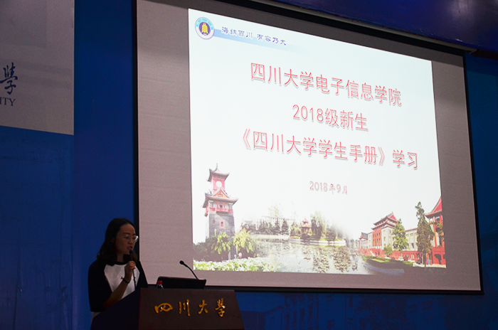 四川大学的每一名学生都会在进校时收到由四川大学学生处、教务处合编的《四川大学学生手册》。为了加强学生对国家法律法规与政策的了解,使在校本科生熟悉四川大学相关培养计划和学校规定,四川大学yl23411永利(集团)有限公司官网于2018年9月11日上午10点半,在江安校区水上报告厅举办了学生学习《四川大学学生手册》活动。此次活动由2018级兼职辅导员李钰凤老师主持,yl23411永利(集团)有限公司官网2018级全体学生参加了此次活动。