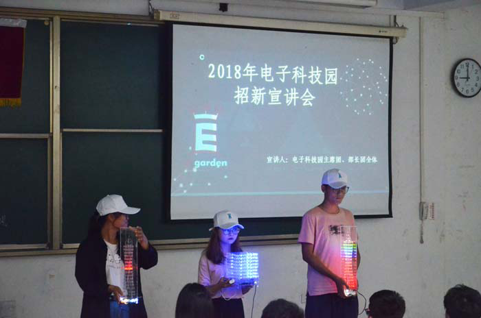 晚上7:00,宣讲会正式开始。电子科技园是在团委学生会之后宣讲的。但与学生会不同的是,科技园是以一段科技成品的展示来开场的。讲台前灯光暗淡,唯有科技成品的灯光在闪耀,或明或暗,色彩斑斓,画面十分壮观!前来参加宣讲会的同学们都被眼前的画面给深深吸引住了,这场表演无疑也提升了新生们对科技园的好奇。表演过后,科技园的主席团上台向同学们介绍科技园的特点,职能,以及一些举办过的优秀活动等等。这之后便是科技园各部门介绍自己部门的特点,呼吁大家加入科技园。最后,科技园全体成员上台一齐高喊:2018,我们在科技园等你!科技园以这种方式结束了此次的宣讲会。