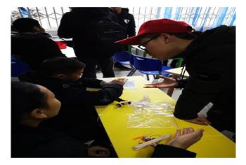 志愿者正在指导小朋友进行组装 |