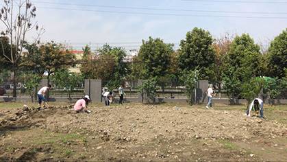 本次实践活动主要是领导和老师们一起带着学生们劳作。实践开始,老师们带领学生们一起搬地里的石头,在清理完土地里的石头之后,学生们开始用铲子在土地的两边铲出沟壑,明确了自己学院的种地范围。最后,老师和领导们亲自讲授并示范了种植作物的技巧以及将植物转移的方法。紧接着,同学们开始自己去尝试种植植物,整个活动都在师生们共同的劳动中度过。