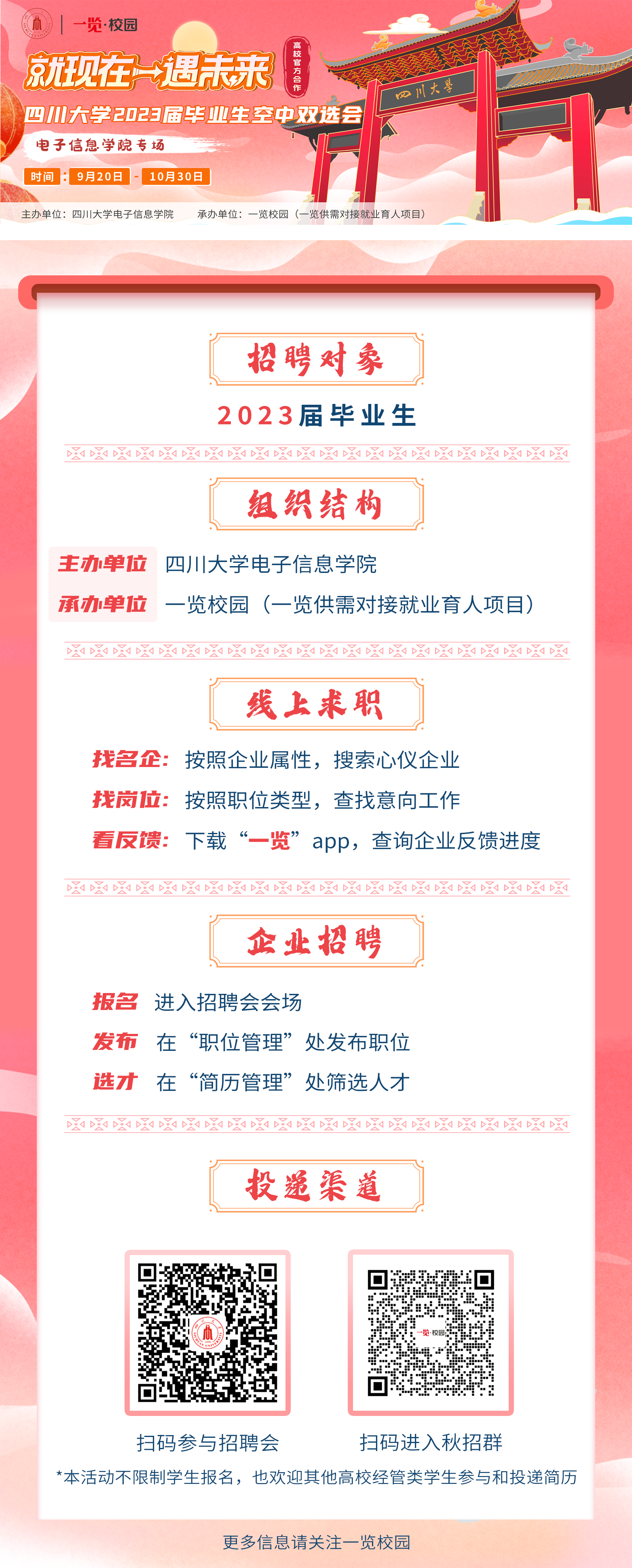 您好!衷心感谢贵单位对我校就业工作的关注和支持!为切实做好23届毕业生就业工作,畅通学校与用人单位之间人才培养与输送的路径。四川大学yl23411永利(集团)有限公司官网联合一览英才网于2022年8月30日至10月30日举办“就现在,遇未来”四川大学大学2023届空中双选会电子信息学院专场。此次招聘为纯公益活动,用人单位和毕业生均免费参会。现就有关事项通知如下: