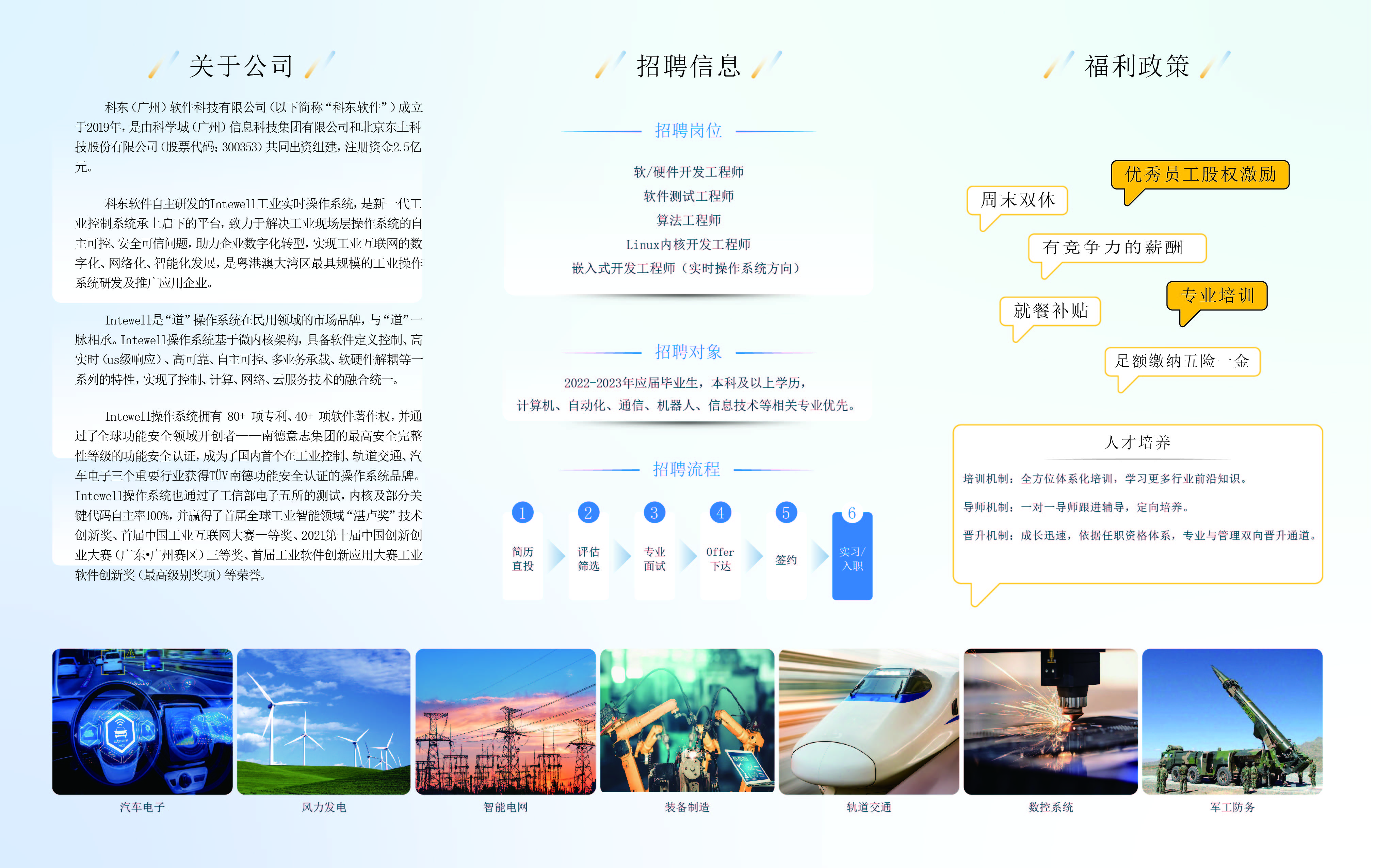 科东(广州)软件科技有限公司是中国工业互联网底层技术信创工作组首任组长单位北京东土科技股份有限公司(股票代码:300353)联合大型国资企业科学城(广州)信息科技集团有限公司共同组建的一家专注于国产自主嵌入式实时操作系统研发及推广应用的企业,注册资本2.5亿元,公司总部在广州,并在成都设有研发中心,专注于操作系统内核及组件的开发工作。公司现有员工75人,其中专业技术人员占比67%,专业技术人员90%为本科或以上学历。公司研发的Intewell工业嵌入式实时操作系统,以高实时、多业务并发处理以及安全可靠等特性广泛应用于工业控制、智能制造、汽车电子、轨道交通、医疗器械、智能电网及航空航天等领域。