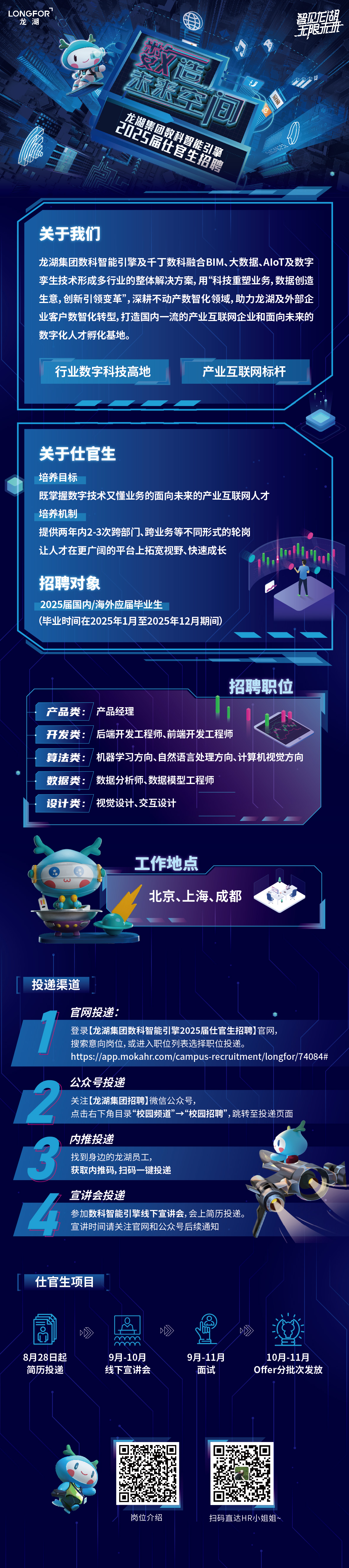 Ø 官网投递:登录【龙湖集团数科智能引擎2025届仕官生招聘】官网搜索意向岗位,或进入职位列表选择职位投递https://app.mokahr.com/campus-recruitment/longfor/74084#