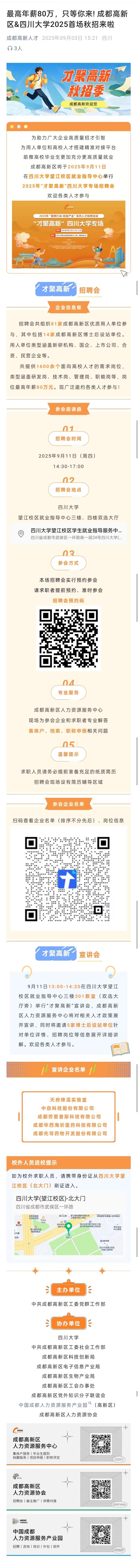 成都高新区今年即将于9月11日(下周四)14:30-17:00在望江校区就业指导中心三楼、四楼举办“才聚高新”四川大学专场招聘会。