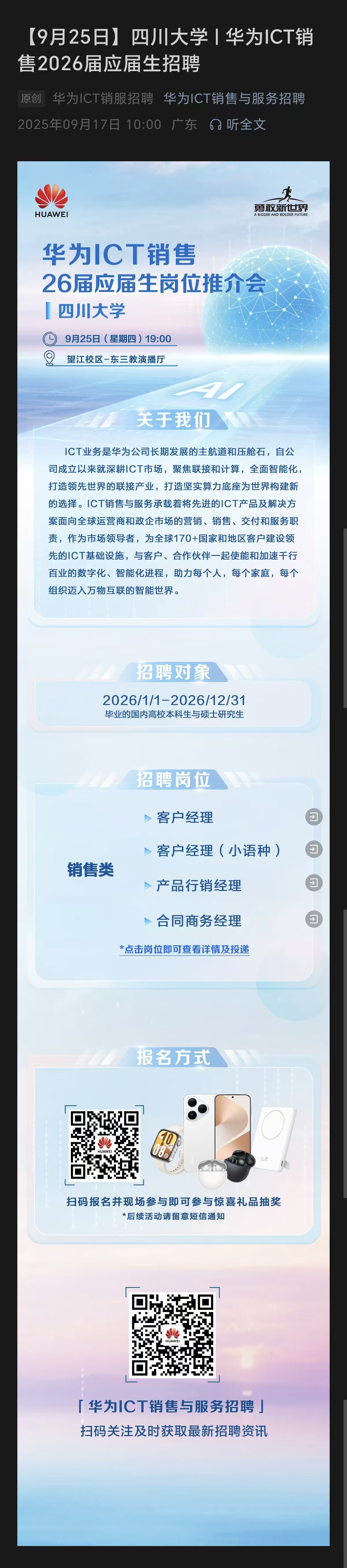 9月25日19:00东三教演播厅 华为ICT销售推介会