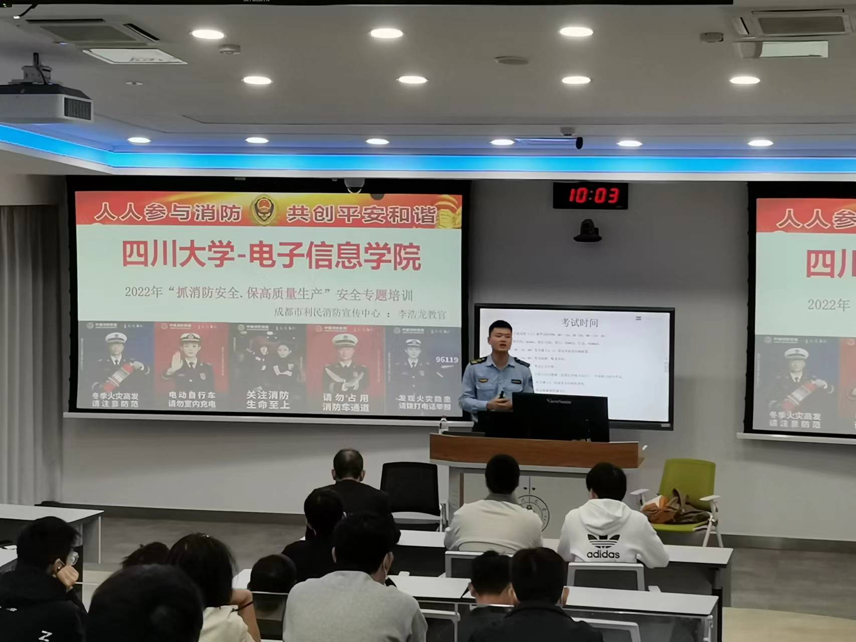 在本次专题活动中,来自成都市利民消防宣传中心的李浩龙教官结合近年火灾事故案例,从近年来火灾持续高发的原因、学生宿舍消防注意事项、灭火器的使用方法、相关灭火方式、必备消防设施等方面强调了生活中防火的重要性,并重点讲解了面对火灾浓烟时如何使用防毒面具,以及如何开展自救等消防知识,进一步提高了师生应对突发事件时的协调配合能力,增强了防火及紧急自救、互救的意识和能力。