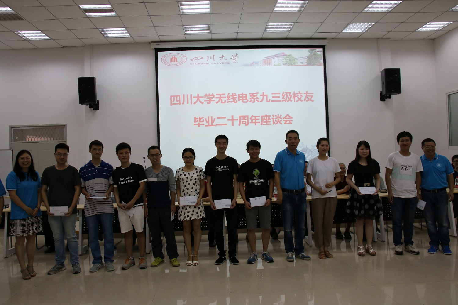 座谈会伊始,93级校友代表发言,回忆了二十年前的校园生活,老师的谆谆教导,以往的师生趣事等,并代表全体返校校友向学院和老师致以诚挚的祝福和衷心的感谢;93级校友返校不忘在校的学弟和学妹,在座谈会现场,向经同学自行申请,由93级校友评定的10名在校学弟和学妹颁发了助学金,希望学弟、学妹们在校努力学习,成为对社会有贡献的人。