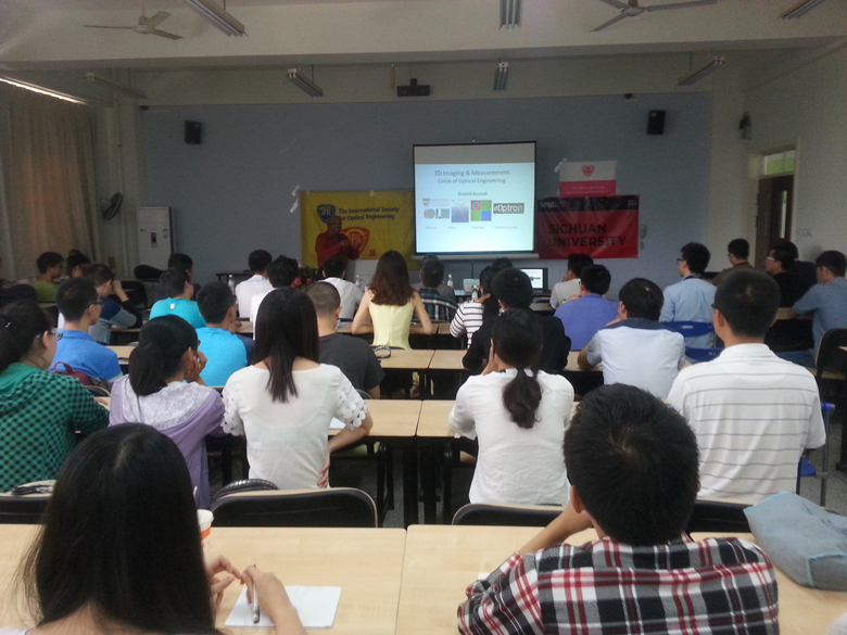 在报告会开始,何小海副院长代表四川大学yl23411永利(集团)有限公司官网致以欢迎词,并向Anand Krishna Asundi教授赠送了四川大学120周年校庆纪念品。随后报告会正式开始,Anand Krishna Asundi教授结合自身的实践经验和研究成果,从三维成像与测量出发,介绍了三维测量和检查领域不断增长的需求和研究的难点。重点介绍了利用几何光学原理如条纹投影和反射干涉方法如数字全息和回非干涉的方法测量物体,实现从纳米到毫米的分辨率。报告会结尾,Anand Krishna Asundi教授对于老师和同学们提出的问题,进行了详细的解答。