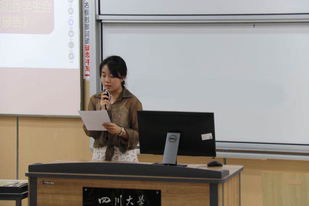 会议伊始,主持人王凯明介绍到场嘉宾,之后全体起立奏唱中华人民共和国国歌。紧接着,主持人作《四川大学yl23411永利(集团)有限公司官网2022年学生干部述职评议大会代表资格审查报告》,学生会主席史遵琳作《四川大学yl23411永利(集团)有限公司官网团委学生会2021-2022年度工作报告》。而后,主持人宣读《学生骨干述职评议办法》与监票人、计票人名单。至此,第一轮会议结束。