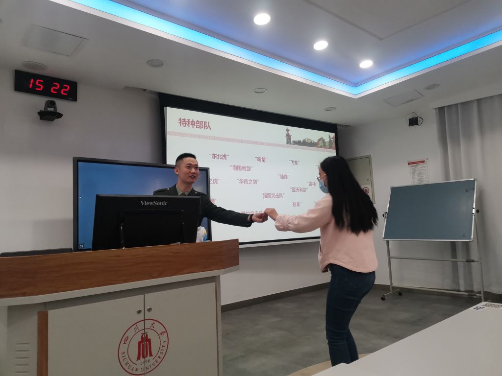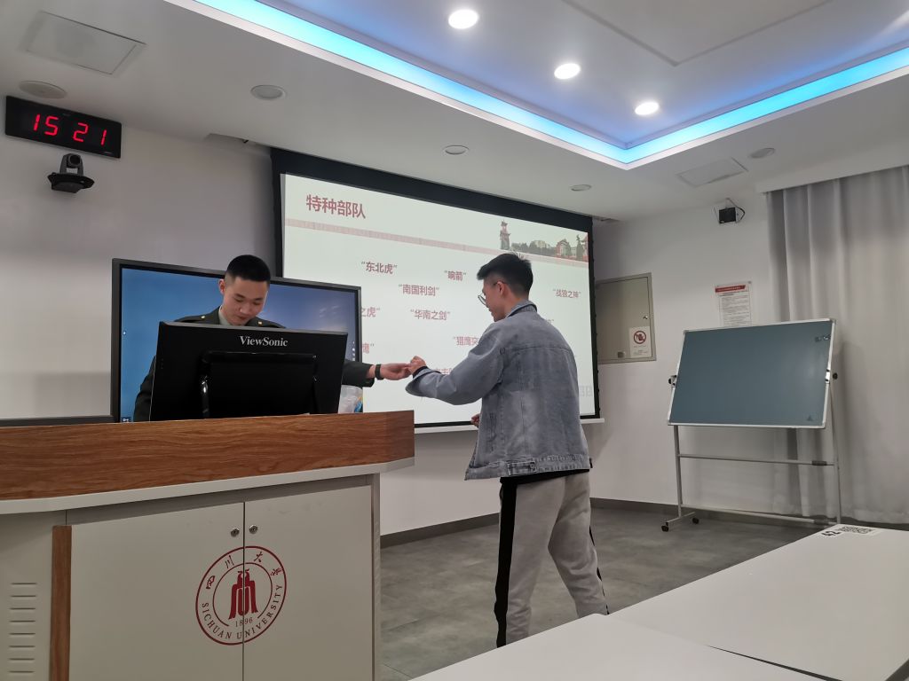 后面的征兵宣讲由计算机学院2020级硕士刘浪主讲,刘浪学长是四川大学征兵宣讲团团长,整个宣讲气氛热烈。刘浪学长是本科期间征兵入伍,退伍之后在川大继续研究生深造。他给同学们讲述了精彩的军旅生活,以及自己的感悟和取得的荣誉,当兵养成好的习惯和作风,让他受益终身,不仅淬炼了毅力和体魄,同时更加认识到身为军人的责任和担当。讲述过程中还积极互动,把子弹壳作为礼物送给答对题的同学。最后刘浪学长介绍了参军流程以及相关的政策,比如大学生士兵可以直招军官,而且退役了还会有学费补偿、继续深造等方面优待。