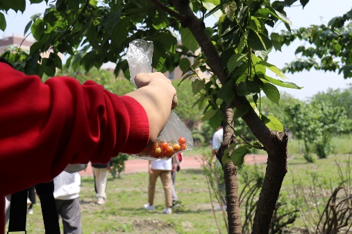 江安的采摘园一片生机勃勃,翠绿的叶子、鲜红欲滴的果实、芬芳的果香都让人感到春天到来的曼妙脚步。看到一棵棵长满红红樱桃的树木,大家都跃跃欲试,想要体验亲自摘下果实的喜悦感。同学们一边摘樱桃一边互相交流农作相关知识,充分感受到清新的田园气息,体验了采摘樱桃和品尝鲜果的乐趣,陶醉于春意萌动的生机中。一个小时后,每个人都有了丰硕的成果。有同学在忙碌之后表示:“虽然流了许多汗水,但还是感受到了劳动的快乐和幸福,学习上的压力也释放了不少。”