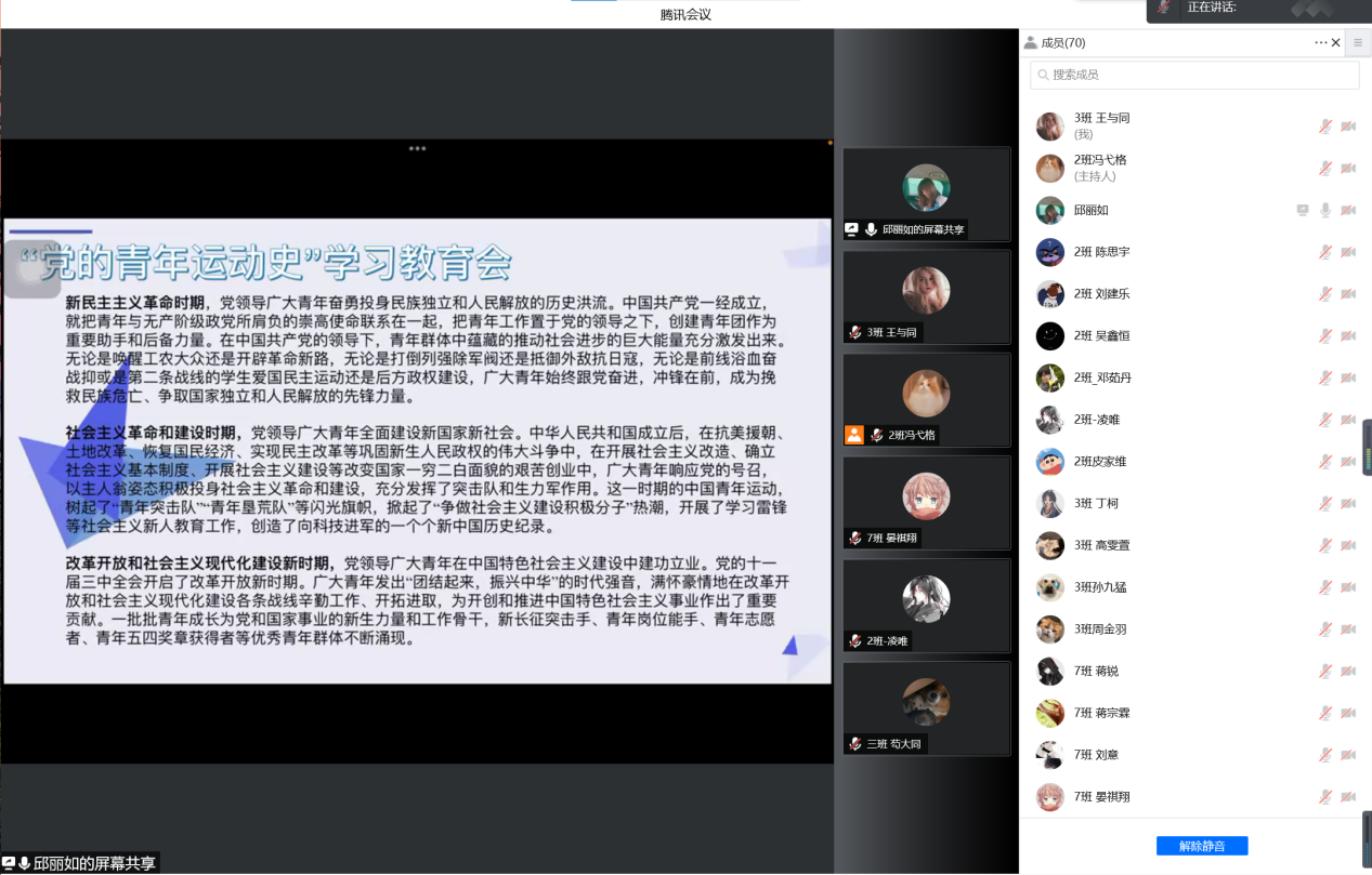 2022年5月4日晚9点半,四川大学yl23411永利(集团)有限公司官网本科2020级2班、3班和7班团日活动在线上举行。本次团日活动的主题是“青春心向党—坚定跟党走、建功新时代”。举办本次团日活动旨在通过回顾党的百年奋斗重大成绩和历史经验,特别是党领导中国青年运动的光辉历程,引导团员青年深刻感悟新时代党和国家事业发展的伟大成就和经验教训;同时组织开展学习先进精神,引导青年深刻体会习近平总书记对青年一代健康成长的重要要求,提升同学们的社会责任感和使命感。