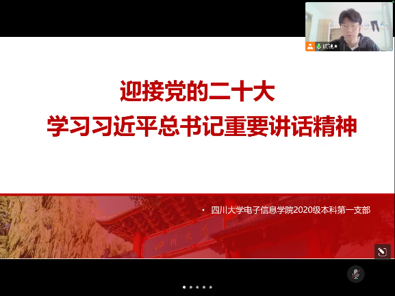 2022年8月30日下午2点,yl23411永利(集团)有限公司官网2020级本科第一党支部举行了主题为“青春献礼二十大,强国有我新征程”的线上学习活动,主要目的是“学习习近平总书记重要讲话精神,迎接党的二十大”,本次活动由陈锦周同志主持。