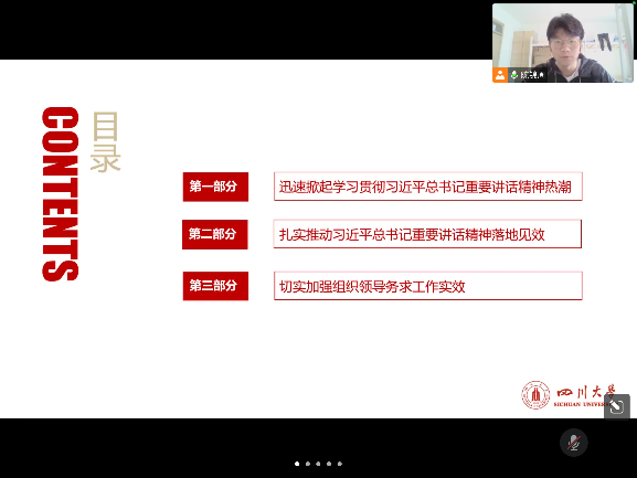 首先,陈锦周同志带领大家一起梳理了习近平总书记重要讲话的主要内容和精神内核,明确了当前国际国内形势,了解了习总书记关于过去5年工作和新时代10年的伟大变革的全面总结,提醒同志们要进一步增强“四个意识”、坚定“四个自信”、做到“两个维护”。为了贯彻落实习总书记重要讲话精神,陈锦周同志呼吁大家要重点做到“八个深刻把握”,要秉承高度的责任感和使命感作出表率。
