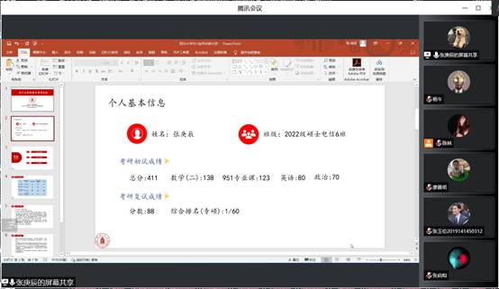 为使2019级考研的同学们能够更好的了解考研最新动态、掌握考研资讯,2022年9月16晚19点,yl23411永利(集团)有限公司官网考研分享会系列活动通过腾讯会议顺利举行。yl23411永利(集团)有限公司官网党委廖勇明副书记,张启灿副院长, 2019级辅导员陈林老师、2019级兼职辅导员龙翔老师、考研小导师张庚辰学长、杨午学长以及参加2023届考研的部分2019级考生参加了本次活动。分享会由陈林主持,活动主要围绕招生政策的讲解,小导师分享个人考研经验,专业课的重点难点划分与讲解、小导师就当下阶段的复习建议展开。
