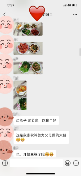 对于家长们来说,孩子们的体贴和懂事让他们骄傲与感动。来自海南的邱同学为父母做了一顿丰盛的晚餐,做完当晚,父母就发到家族群里“炫耀”,这让她既好笑又愧疚。“上了大学之后我就很少能够跟父母在一起,更别提为他们做一顿饭菜。我没有想到,我这顿小小的饭菜在他们眼中会是绝世佳肴,我知道长大之后能够陪伴父母的时间会越来越少,但我想我会珍惜这些能够陪伴在他们身边的时间,为他们做顿饭,陪他们看电视,让他们感受到自己的女儿有多么爱他们。“