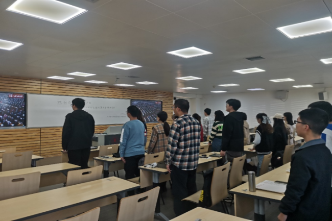 一大早,同学们都怀着激动的心情到达教室,准备收看党的第二十次全国代表大会的开幕式直播,聆听习近平总书记向党的二十大做的报告,并第一时间了解全党未来的奋斗目标与规划发展蓝图。上午10点,雄壮的国歌声从电视直播中传来,收看直播的同学们全体起立,对着直播中冉冉升起的国旗齐唱国歌。开幕会历时近两个小时,习近平总书记的报告凝聚人心、催人奋进,全部同学全程认真聆听、深入学习并领会。当习近平总书记的报告结束时,大家也随着现场代表们一起热烈鼓掌,以表达对这次团结、胜利、奋进的空前盛会的热烈祝贺,表达对总书记的高度依赖、坚决拥护和衷心爱戴。