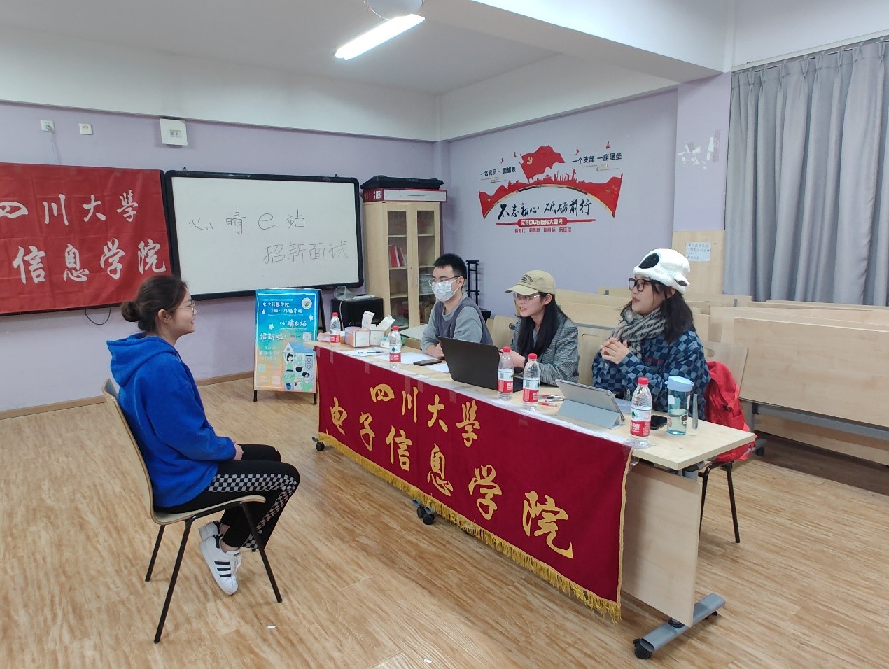 10月13日,电子“心晴e站”通过公众号推送、海报等的形式发布了招新细则和部门介绍,同学们通过线上方式积极报名。10月15日下午14:00,望江校区面试开始。面试现场环境舒适温馨,面试气氛轻松愉悦,站点成员与参加面试的同学以聊天的方式相互介绍、相互了解。19:00,江安校区的面试也正式开始。面试现场宽敞明亮,面试气氛紧张而愉快。在面试过程中,同学们都展示出了昂扬的精神风貌,表达了共建站点的决心和强烈的入站意愿。面试结束后,每个参加面试的同学都获得了电子“心晴e站”的首个周边——定制口罩。