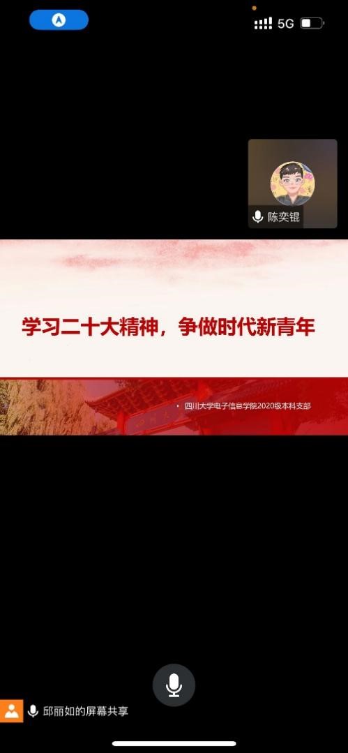在分享环节,同学们紧紧围绕二十大报告,结合自身经历,对二十大精神提出了自己的感悟。陈同学说到:“二十大报告中强调科教兴国和人才培养。提到人才是第一资源,创新是第一动力。而我们正好处在四川大学这样一个优秀的学习平台之上,很真切地感受到学校非常注重对学生创新能力的培养。目前国家对高校对教育的重视程度越来越高,体现在我们学习生活中的各个方面。”