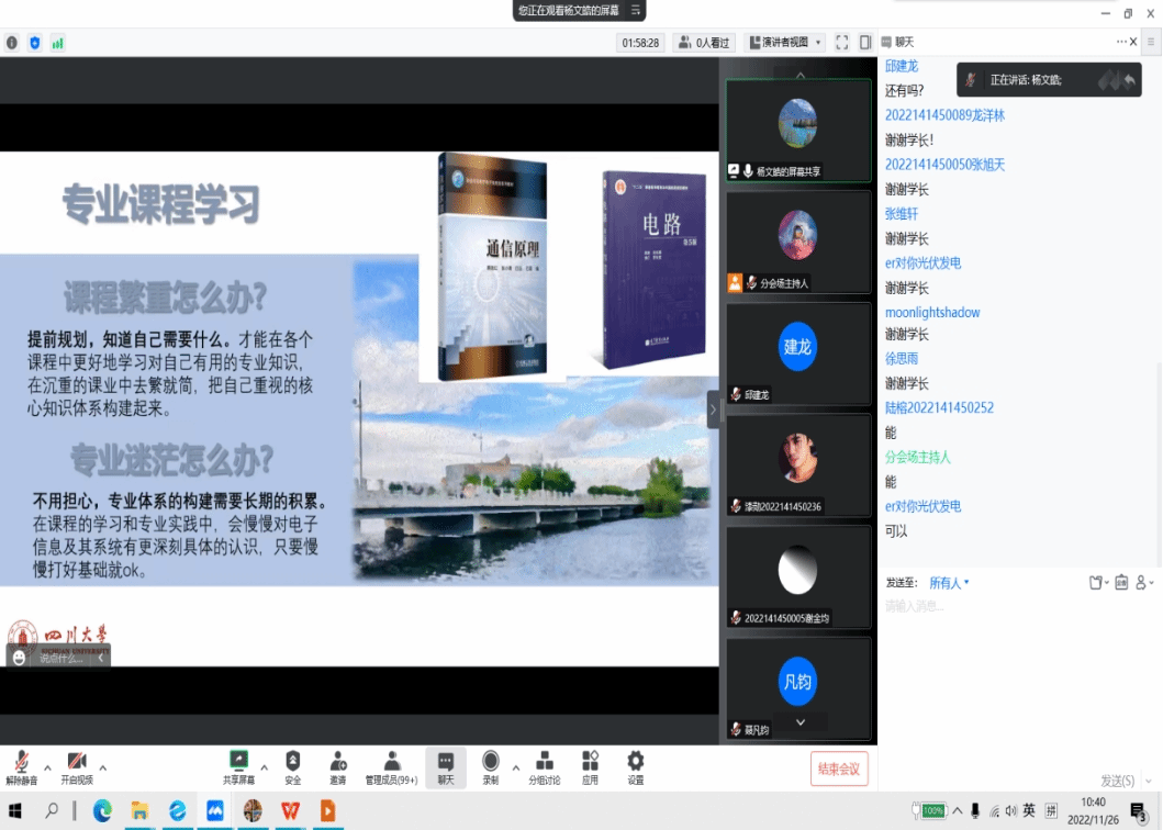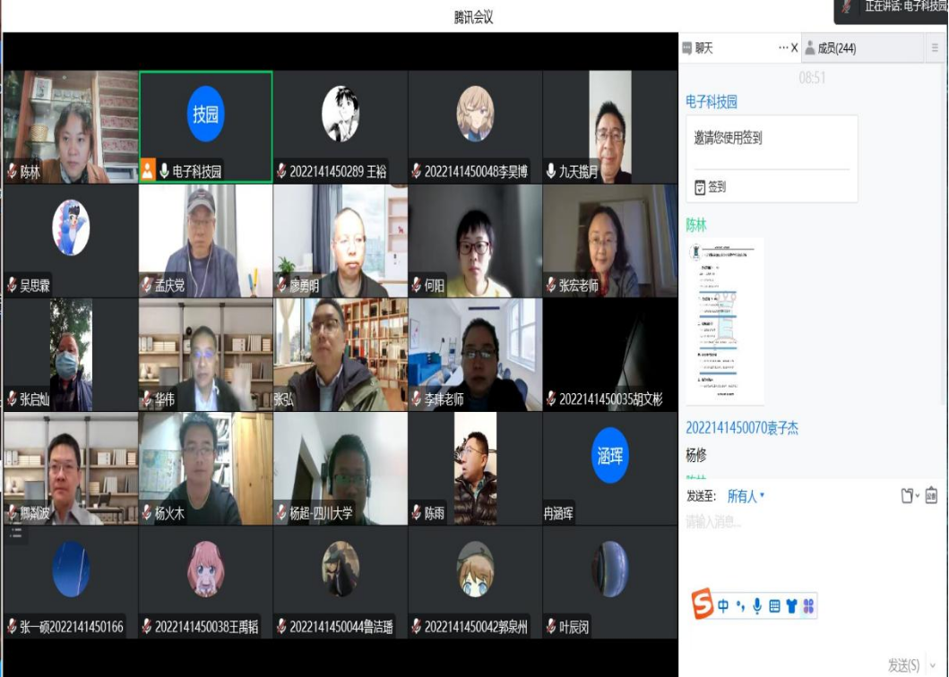 2022年11月26日上午9点,电子科技园2022会员大会暨学术交流会议程在腾讯会议顺利进行。出席议程的有yl23411永利(集团)有限公司官网党委副书记廖勇明老师 、副院长张启灿教授、副院长卿粼波教授、华伟副教授、张宏副教授、陈雨副教授、李玮副教授、杨火木副教授、张弘副教授、孟庆党老师、李小舜老师、孟滋常老师、陈晓娟老师、何阳老师、朱婧老师、陈林老师、科技园优秀学长学姐廖佳佳、吴宇峰、邱建龙、杨文皓,以及科技园主席团,各部部长和全体yl23411永利(集团)有限公司官网同学。