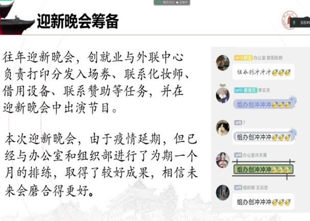 接下来,组织部、办公室、宣传部、创就业与外联中心、体育部、文艺部、权益素拓部、学科部与“腾飞”青年志愿者服务队的代表们分别进行了各部门2022年至2023年秋季学期相关工作的总结,其中包括学期部门工作汇报、部门及成员收获、部门工作不足之处和下学期的工作计划与展望四个部分。