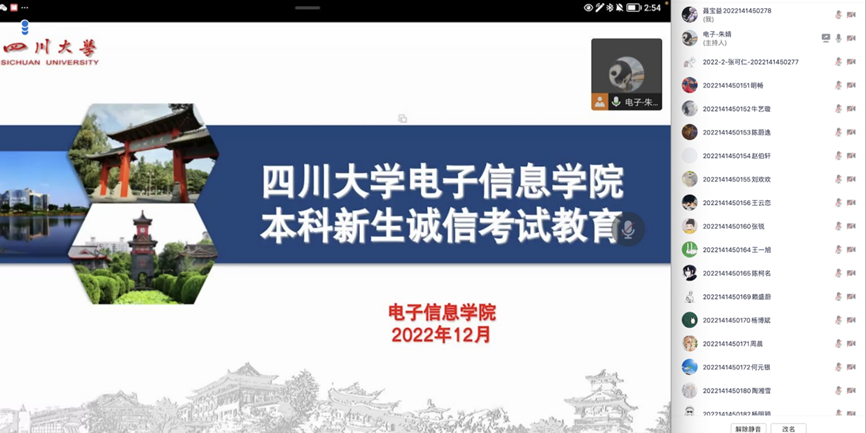 2022年12月9日下午15时,我院2022级辅导员朱婧老师在线上腾讯会议对同学们进行了本次形势与政策课的授课,授课内容主要围绕本科新生的诚信考试教育。本次线上教育处于四六级考试前夕,旨在结合实际,强化学生考风考纪管理,树立学生良好的学习品德并养成诚信考试的习惯。