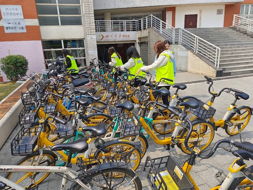 志愿者摆放共享单车