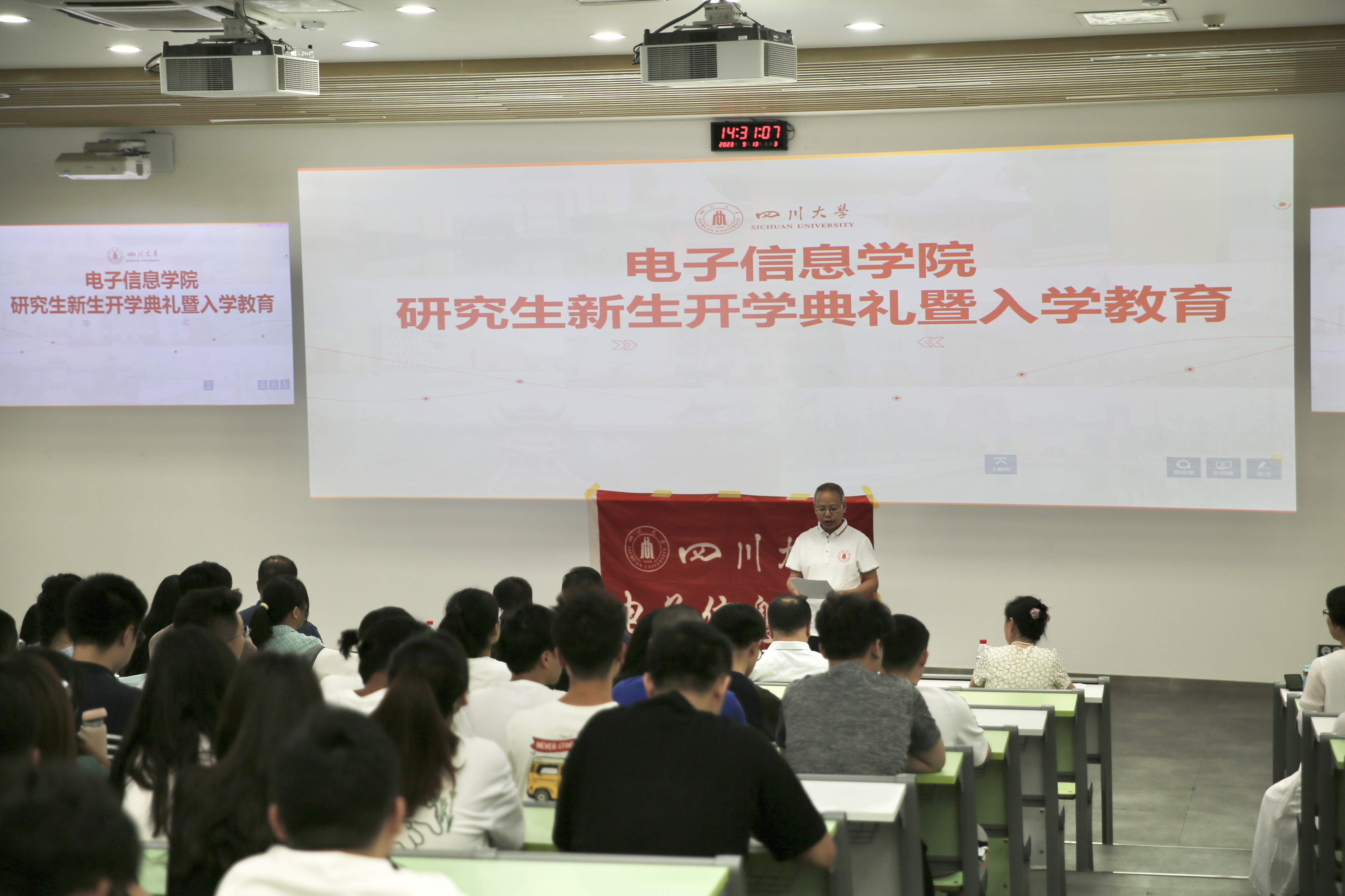 2023年9月13日下午14:30,四川大学yl23411永利(集团)有限公司官网于望江校区基础教学楼C204教室成功举办了2023级研究生新生开学典礼暨入学教育。学院党委邰明松书记、副院长张启灿教授、教师代表张蓉竹老师、教务科赖华老师、蔡苹杨老师、辅导员何惠老师及全体2023级研究生参加了本次典礼,由党委副书记廖勇明主持典礼。