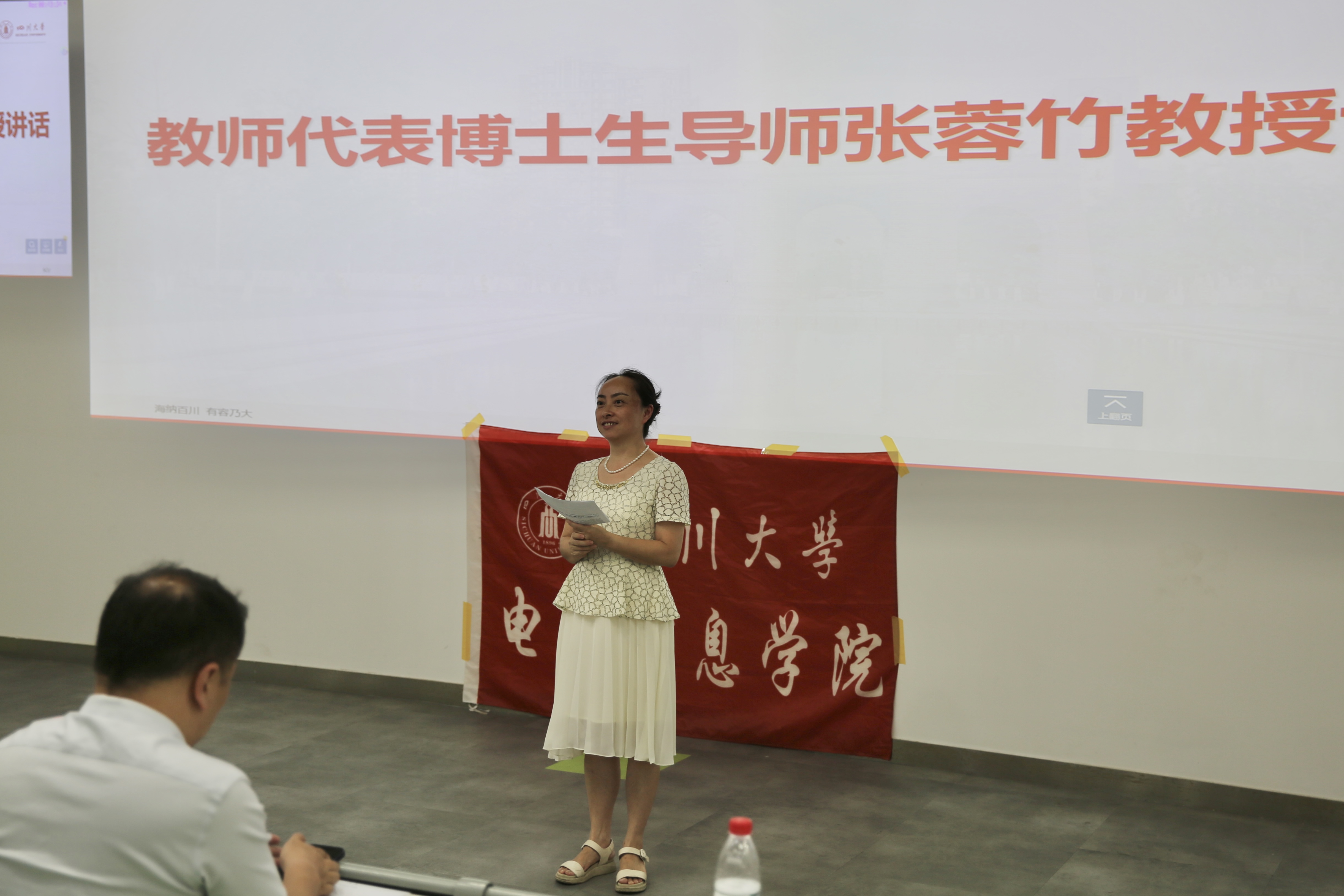 随后,教师代表张蓉竹教授发表致辞,对同学们的到来表示欢迎,祝贺同学们成功上岸。张教授向同学们介绍了学院提供的学习平台以及丰富多彩的文体活动。同时,张教授也提出了几点要求,希望同学们积极思考,追求全面发展,学会发现问题和解决问题,并勉励同学们在研究生阶段取得好成绩。
