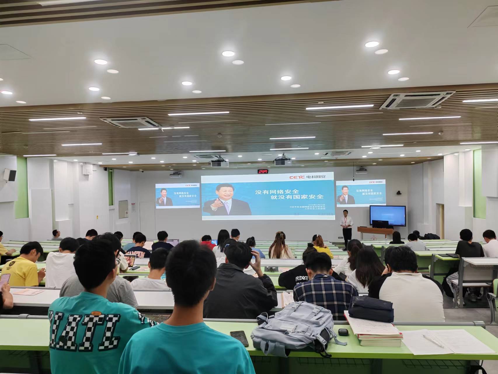 后面,谢老师还邀请到中国电科网安的品牌部汪总为大家讲解了网络安全对于一个国家的重要性,以及网络安全在中国的发展历程,解读了习近平总书记在全国网络安全和信息化工作会议上的讲话,让同学们对于国家安全和网络安全的重要性有了更深地了解。
