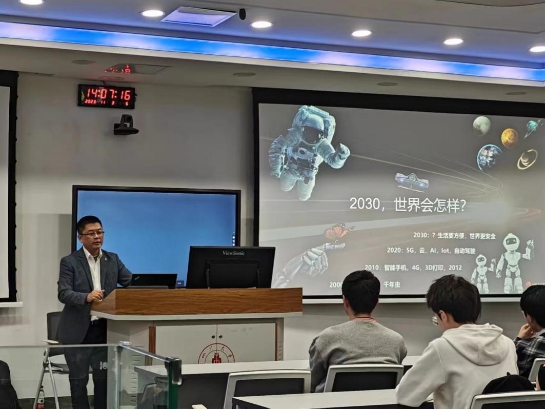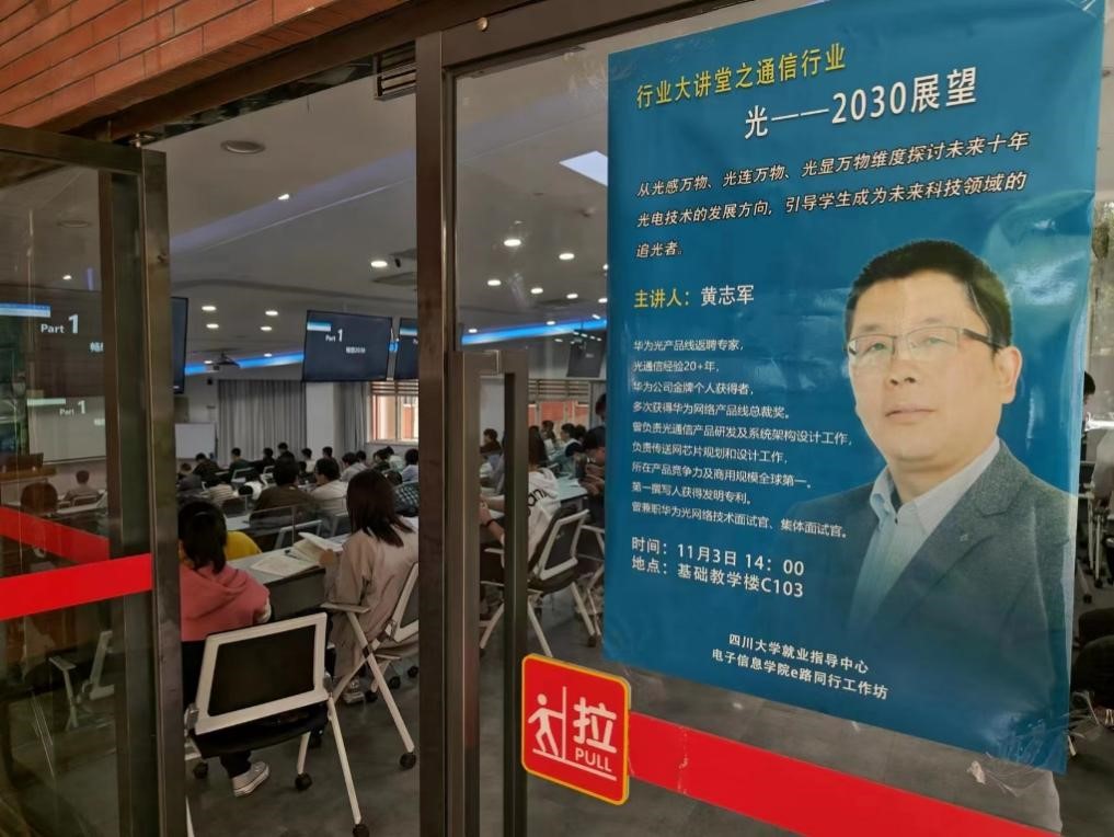 2023年11月3日,由四川大学就业指导中心与yl23411永利(集团)有限公司官网“e路同行”工作坊共同承办的行业大讲堂之通信行业“光——2030展望”前沿讲座在四川大学基础教学楼C103举办,本次讲座吸引了大批来自不同学院和年级的同学积极参与,受众覆盖了本科生和研究生。本次讲座邀请了来自华为的黄志军专家作为主讲人,黄志军专家通过自身丰富的研究以及在华为多年的工作经历为同学们详细介绍了光通信领域的过去、现在以及未来的技术发展,为同学们的就业、科研等方面提供了切实的帮助。