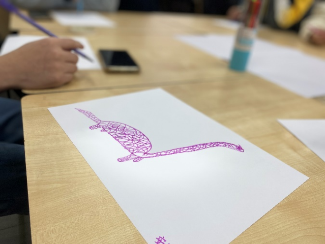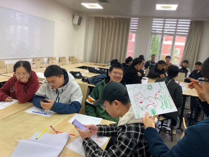 第二阶段是构建动物园,引导同学们认识自我、接纳自我、理解他人。同学们分组作画,画出自己心目中最喜欢的动物形象,并在组长的带领下构建出一个动物园,之后由何惠老师为大家一一解释画作含义:同学们画出的动物一定程度上代表了自己的个性,这个动物的特点、习性、特长、技能是什么。在随后的自由发言环节中,同学们积极地分享了自己的领悟和体会,明白了无论什么动物,都在动物园里能找到自己的一席之地,在人群中,没有必要与别人一样,接纳自己的不同,接纳自己的个性,求同存异,共同构成多彩的丰富的动物园。