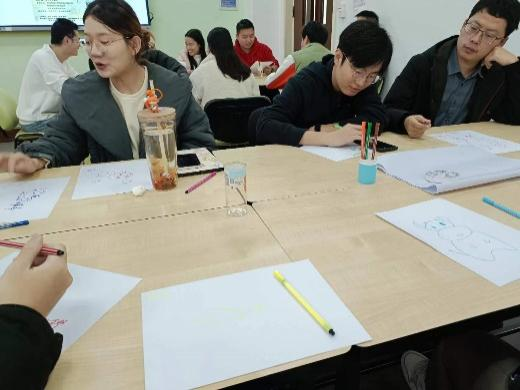 接着,她引导同学们在纸上画下自己最喜爱的动物,同学们用水彩笔在白纸上画下熊、猪、牛、马等各种动物,何老师也根据同学们画下动物的位置、大小、身体比例等对同学们内心的想法以及隐藏的压力进行了分析,促使我们更深入地了解了彼此的内心世界。在每个同学完成后,何老师让每一组的同学们将绘画动物粘在大的白纸上组建动物园,引导同学们看到动物园是由各种不同的动物组成,就像我们的团队,接纳不一样的人们。