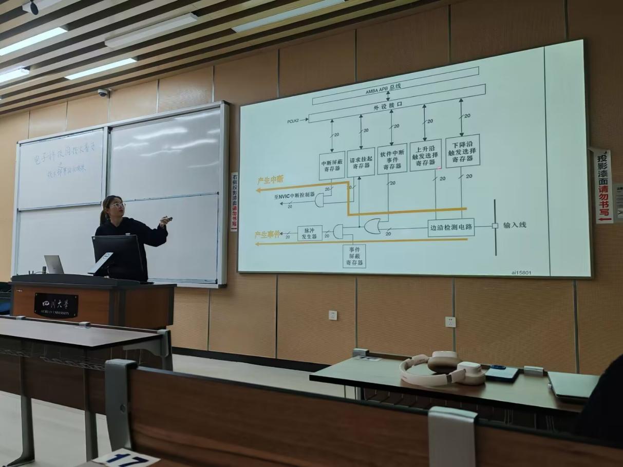 首先,李唯含学姐带来了有关中断功能相关知识的讲解,介绍了中断及中断嵌套的定义、使用中断的好处等基础知识,并就NVIC优先级分组、EXTI、AFIO引脚复用等相关知识进行详细讲解接下来,为加深同学们对于中断相关知识的理解李代强学长在李唯含学姐所讲述内容的基础上进行了补充说明,并绘制框架图帮助同学们更好地学习中断相关知识。最后,杨滨荣学长带着同学们进行编写程序的实际操作练习,使用能实现中断功能的程序来控制流水灯的变化模式。