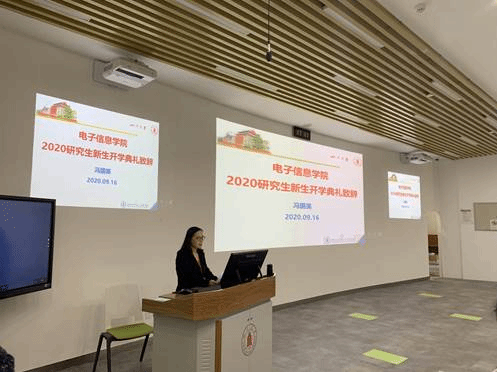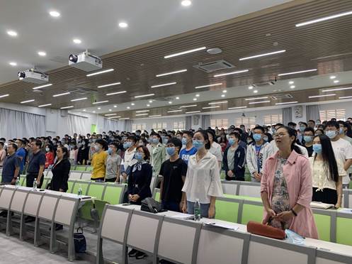 伴着庄严豪迈的音乐,开学典礼拉开了帷幕。全体2020级研究生新生垂手肃立,齐声同唱国歌,在师长的见证下,踏上人生新的旅程。