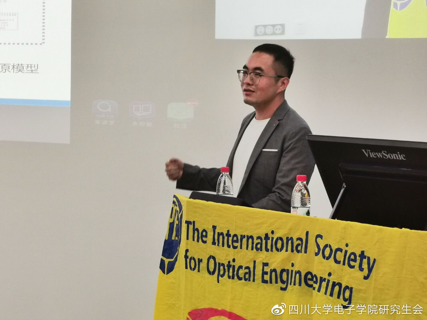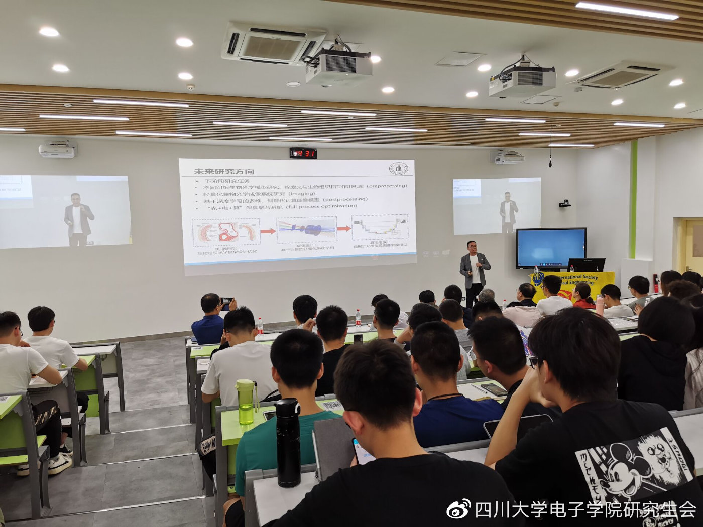 计算机生物光学成像在医疗视觉增强系统的实现,并利用建模进行分析。整个教室座无虚席,同学们也认真聆听、对演讲内容耐心做笔记并积极参与互动,也带动了申博士的演讲激情。