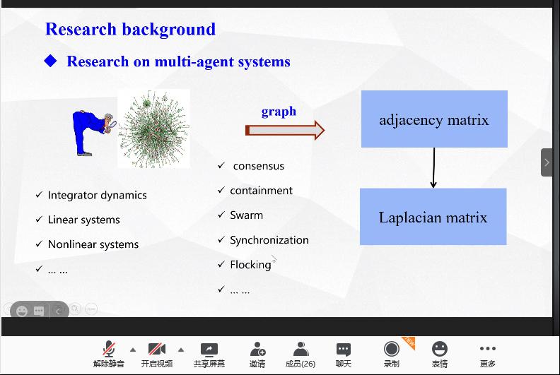 首先,苏厚胜教授做了题目为“正性约束下的复杂网络连边一致性问题研究”的讲座,本报告以基于连边动力学模型的网络化多自主体系统为研究对象,研究其连边一致性控制问题,包括:连续时间连边一致研究基础、基于状态反馈的连边正一致、参数确定或参数不确定下的基于观测器方法的连续连边正一致、离散时间连边正一致、无向和有向网络下的带扇区非线性输入的连边正一致。